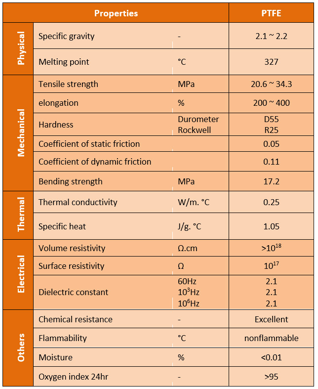 PTFE (پلی تترافلوئورواتیلن) یک پوشش فلوئوروپلیمر نچسب است که بالاترین دمای کارکرد را در بین فلوئوروپلیمرها دارد و ضریب اصطکاک بسیار پایینی دارد، مقاومت سایشی متوسط و مقاومت شیمیایی خوبی دارد. این پوشش معمولاً در جایی استفاده میشود که روانکننده خشک یا پوشش کم اصطکاک یا مقاوم در برابر خوردگی لازم باشد.